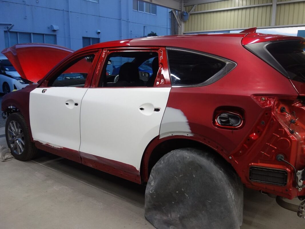 マツダ CX-8(ソウルレッドクリスタルメタリック:46V) 左側面事故 キズ&へこみ板金・塗装・修理 東京都調布市よりご来店のお客様です