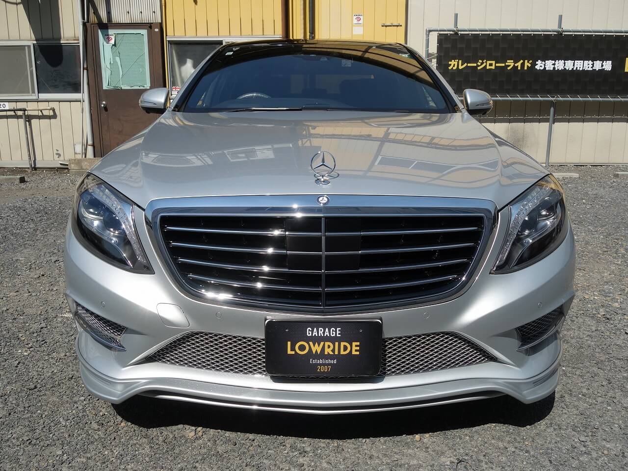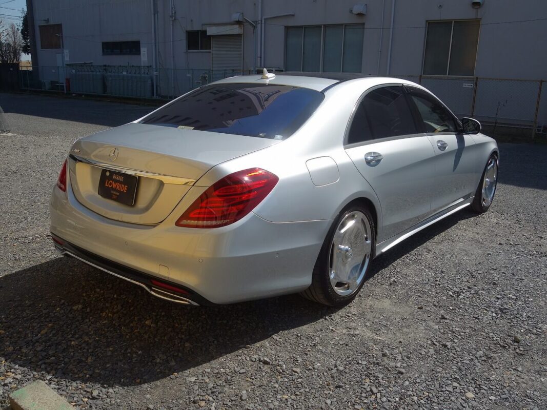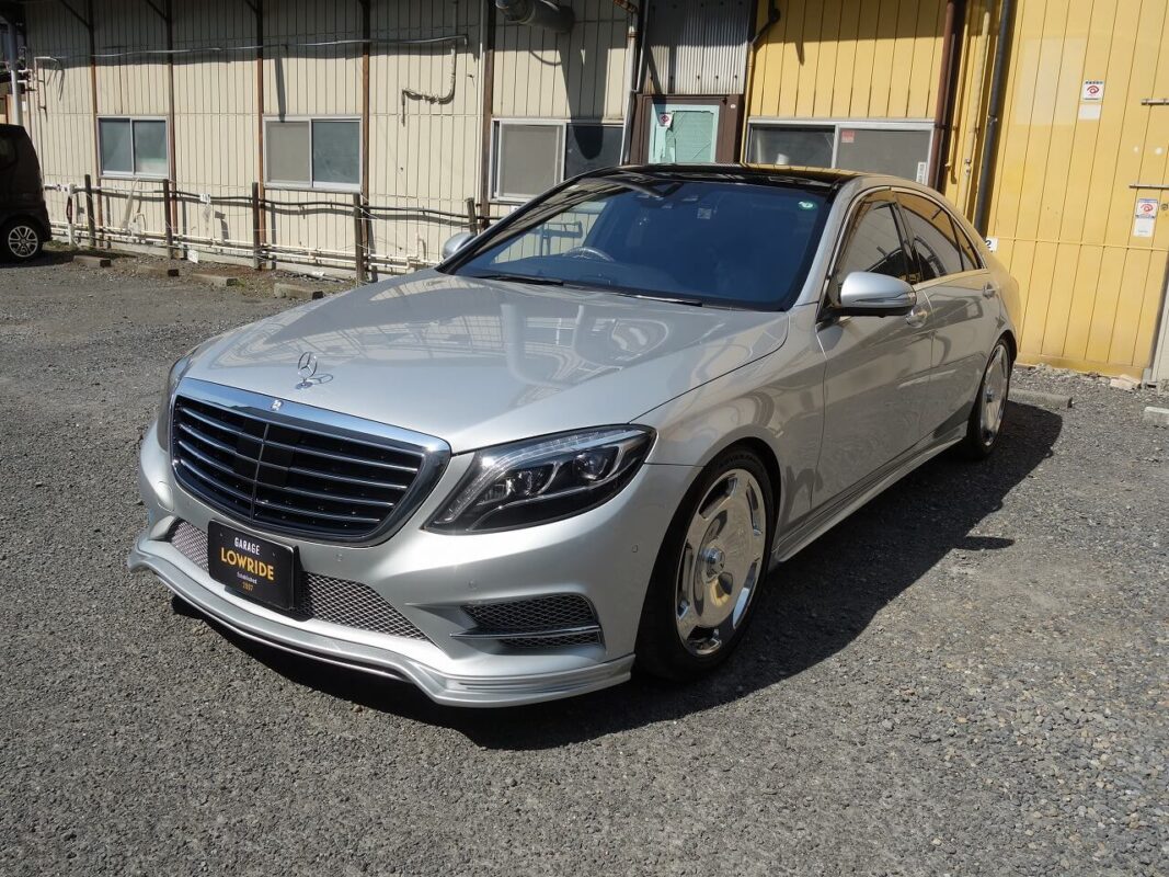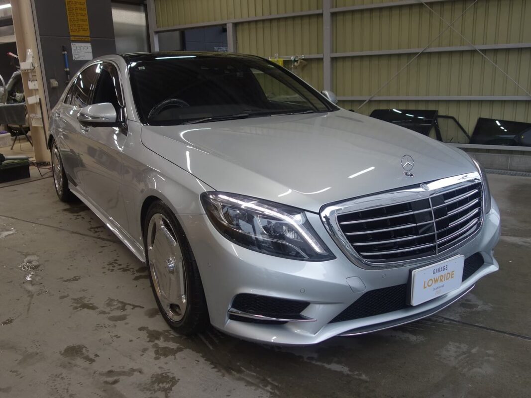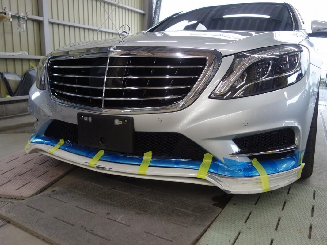 メルセデス・ベンツS500h 持ち込み品中古エムズスピード製フロントアンダースポイラー修理、塗装、取り付けなど 東京都世田谷区よりご来店のお客様です
